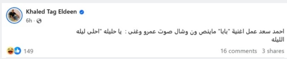 وكتب تاج الدين، في منشور عبر حسابه على منصة "فيسبوك" قائلاً: "أحمد سعد عمل أغنية بابا ماينص ون، وشال صوت عمرو وغنّى يا حليلة.. أحلى ليلة الليلة"، في إشارة إلى التشابه الذي لاحظه بين العملين.