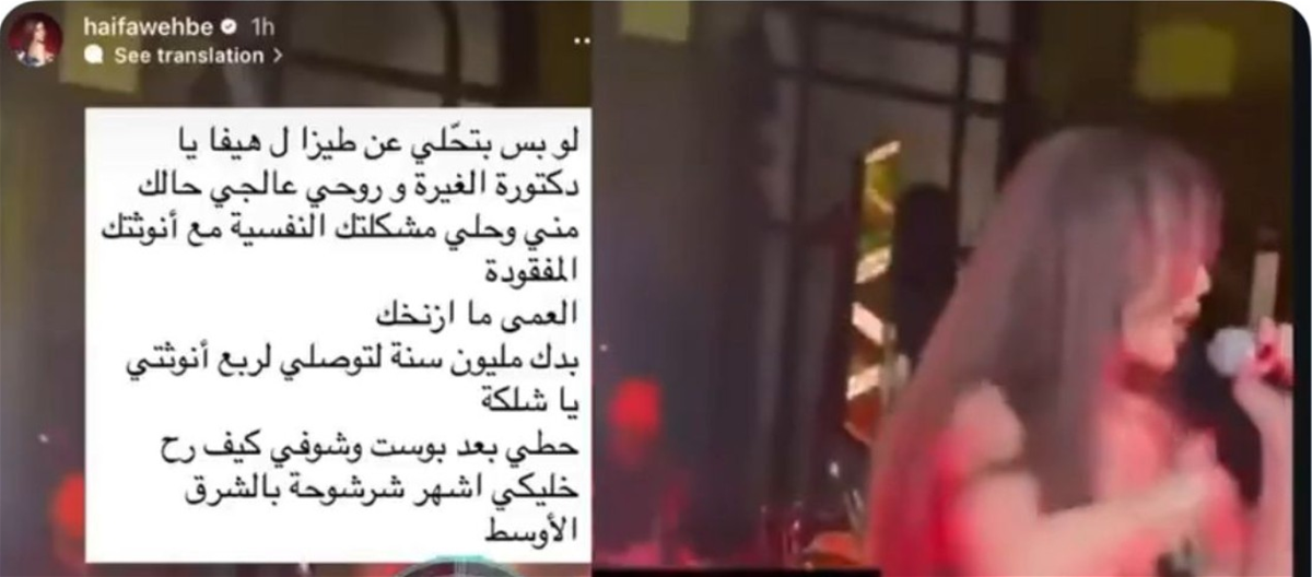 وعلقت هيفا قائلة: "لو بس بتحلي عن طيزا لهيفا يا دكتورة الغيرة، روحي عالجي حالك مني وحلي مشاكلك النفسية مع أنوثتك المفقودة، العمى ما أزنخك… بدك مليون سنة لتوصلي لربع أنوثتي يا.. حطي بعد بوست وشوفي كيف رح خليكي أشهر واحدة بالشرق الأوسط."