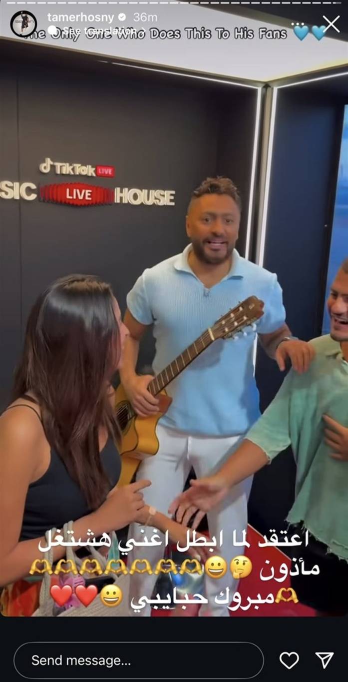 قام الفنان المصري تامر حسني بنشر فيديو عبر خاصية "الستوريز" على حسابه في "فيسبوك" ظهر فيه وهو يشهد على عرض أحد معجبيه الزواج من حبيبته.