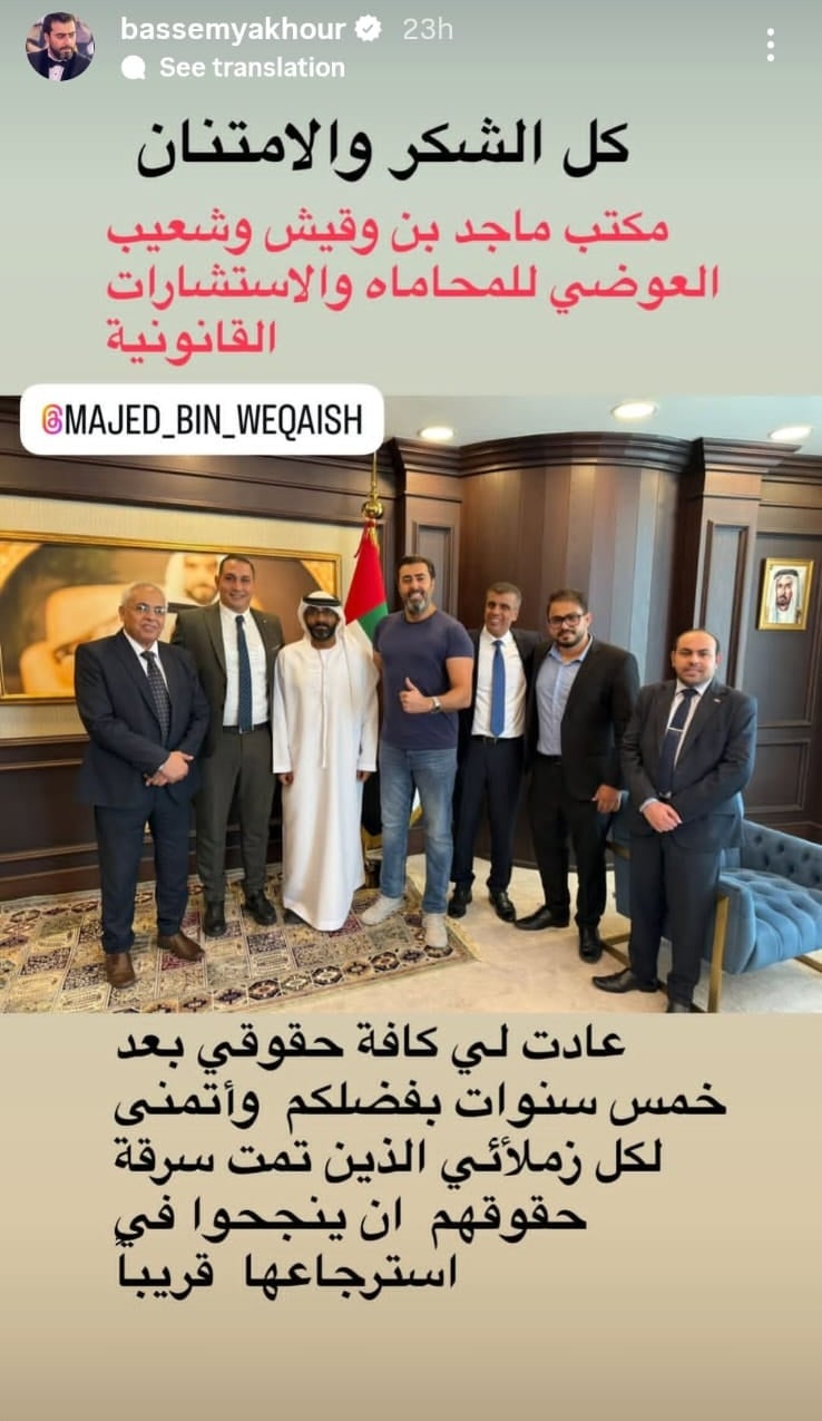 كما نشر ياخور صورة تجمعه بفريق المحامين وأرفقها بالتعليق: "كل الشكر والامتنان لفريق المحامين، عادت لي كل حقوقي بعد 5 سنوات بفضلكم، وأتمنى لكل زملائي الذين سُرقت حقوقهم أن ينجحوا في استرجاعها قريباً".