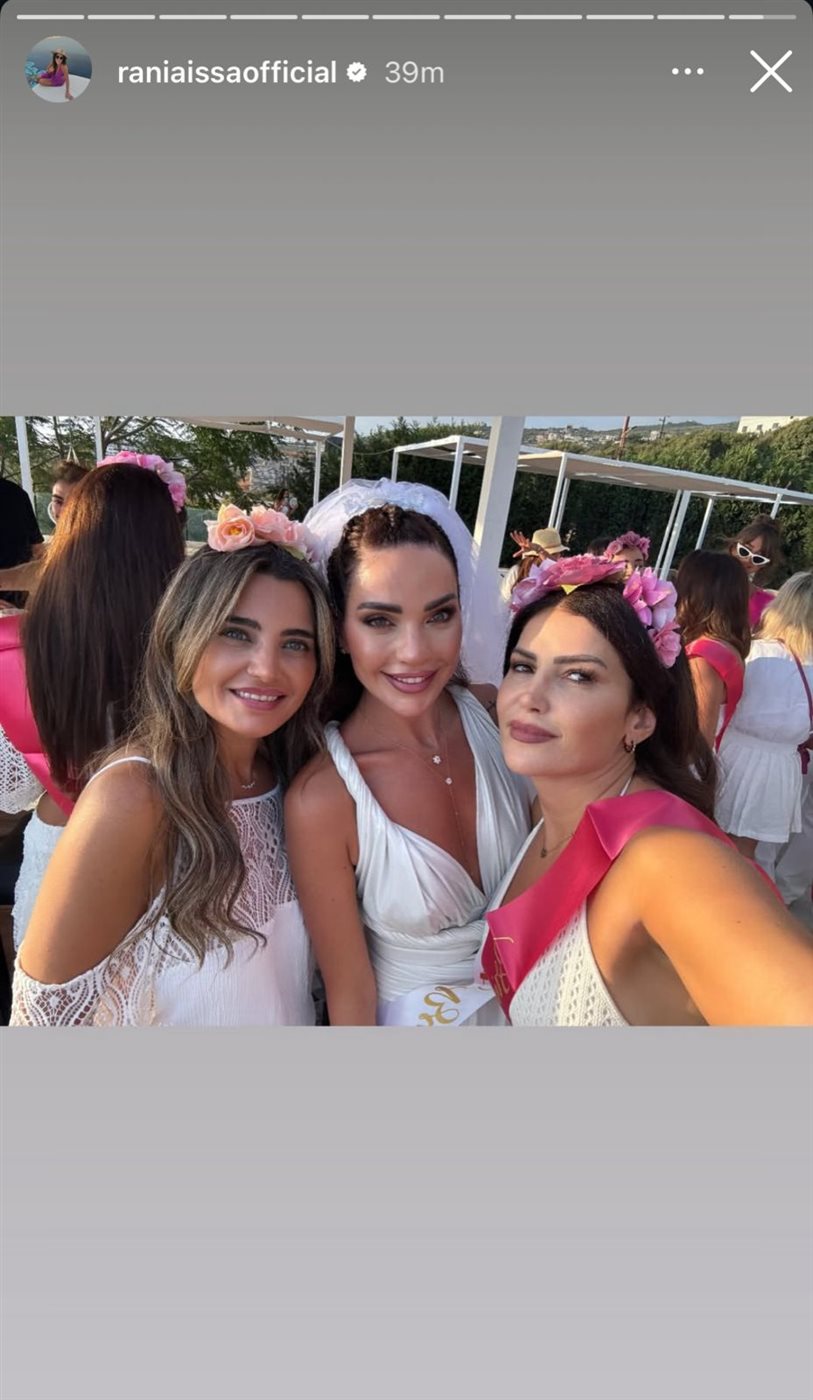شاركت الممثلة رانيا عيسى جمهورها بلحظات من احتفال "وداع العزوبية" للنجمة داليدا خليل، حيث نشرت صورة عبر خاصية "الستوري" على إنستغرام، ظهرت فيها إلى جانب العروس، بإطلالات بيضاء ناعمة.