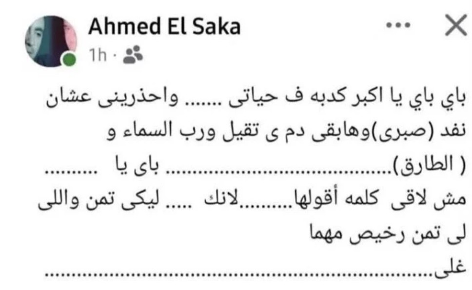 وجاء في المنشور: "باي باي يا أكبر كدبة في حياتي واحذريني عشان نفد صبري وهابقي دمي تقيل ورب السماء و(الطارق)".