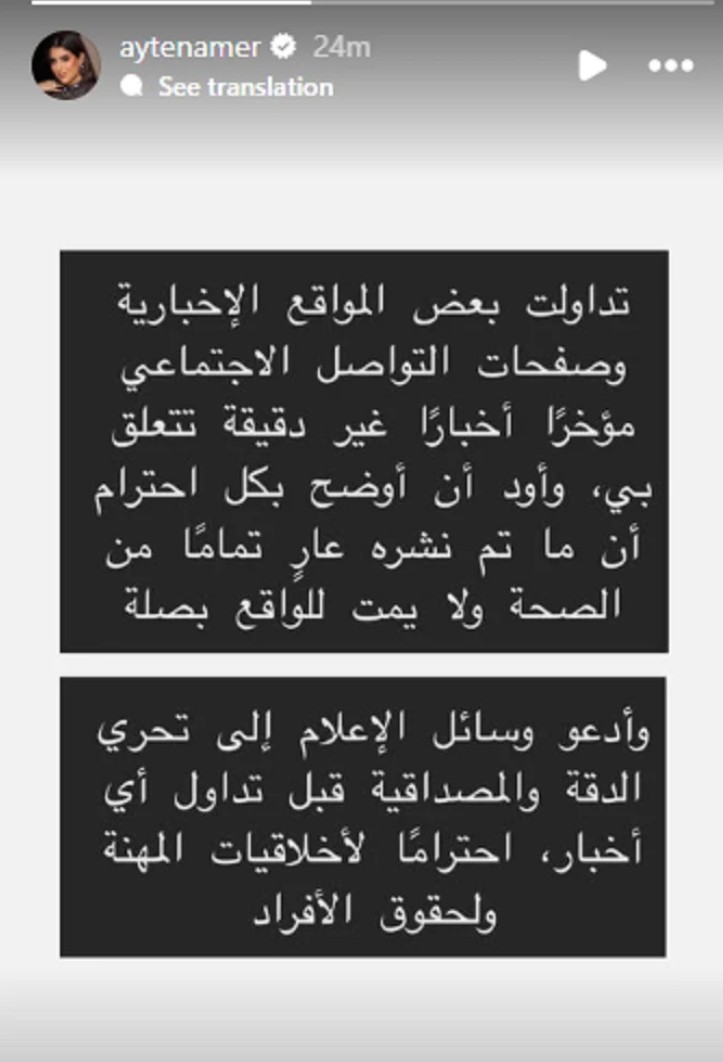 وقالت آيتن من خلال خاصية القصص المصوّرة الملحقة بحسابها الخاص في "إنستغرام": "تداولت بعض المواقع الإخبارية وصفحات التواصل الاجتماعي مؤخراً أخباراً غير دقيقة تتعلق بي، وأود أن أوضح بكل احترام، أن ما تم نشره عار تماماً من الصحة، ولا يمت للواقع بصلة".