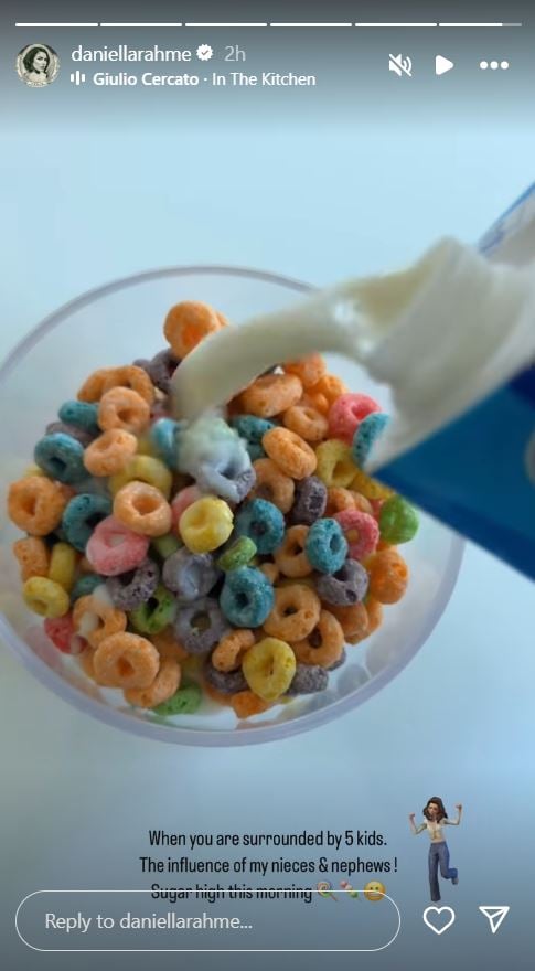 كما نشرت دانييلا رحمة أيضاً مقطع فيديو ظهرت فيه وهي تقوم بتحضير وجبة مكوّنة من رقائق الذرة الملوّنة والحليب وكتبت: "عندما تكوني محاطة بخمسة أطفال. تأثير أبناء وبنات أختي. مستوى السكر مرتفع هذا الصباح".