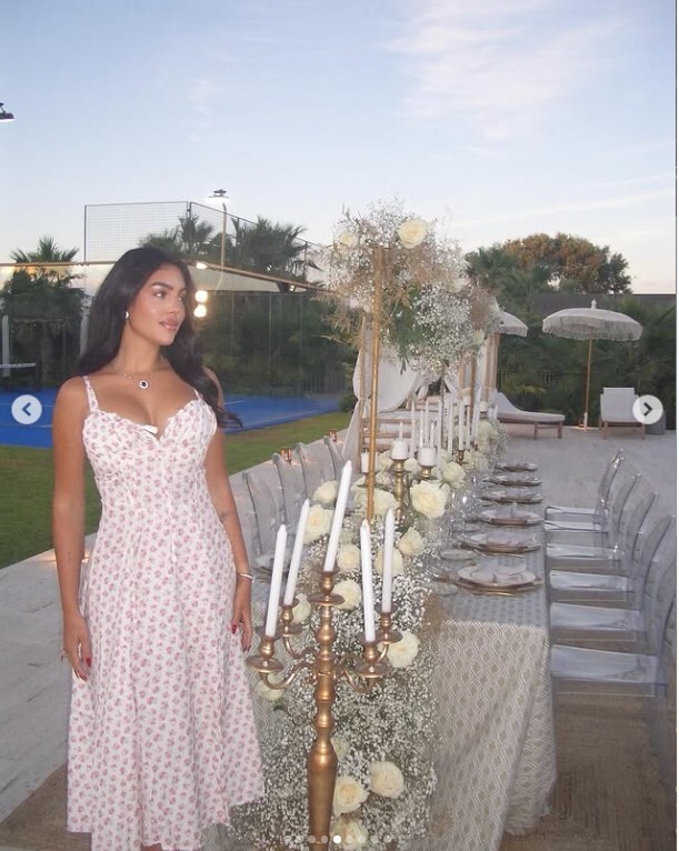 في المنشور الذي تابعه أكثر من 67 مليون متابع، ظهرت جورجينا بفستان أبيض مطبّع بالورود، وسط ديكور رومانسي ضم طاولة مزينة بالشموع والزهور، مع وسادة مطرزة بحرفي "C" و"G" يتوسطهما قلب، في إشارة رمزية واضحة إلى اسميها واسم رونالدو.