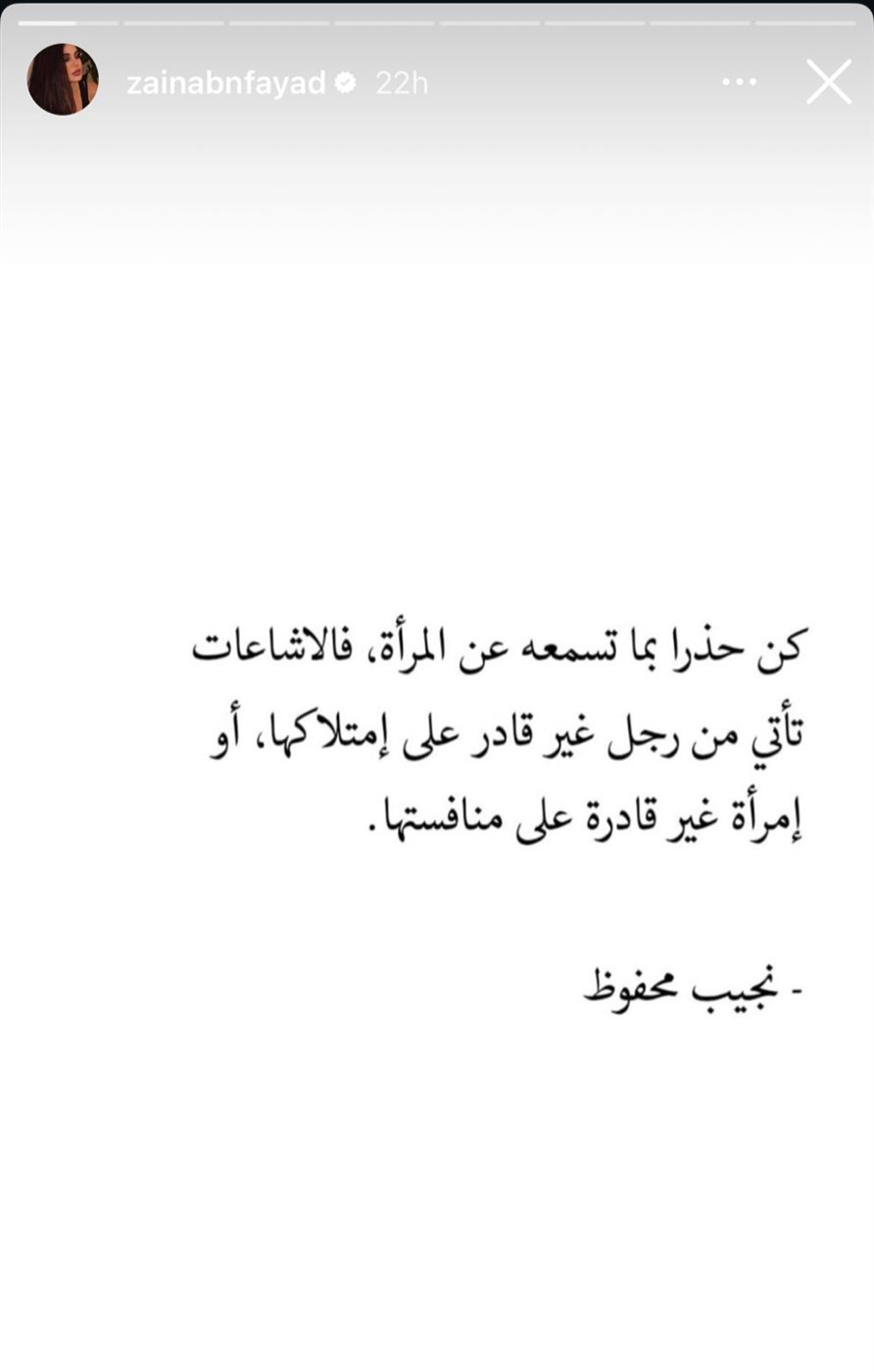 نشرت ابنة الفنانة هيفاء وهبي، زينب فياض، عبر حسابها على "إنستغرام" اقتباسًا لأديب نجيب محفوظ، أشارت فيه إلى ضرورة الحذر من الإشاعات التي تُثار حول المرأة. وقالت في منشورها: