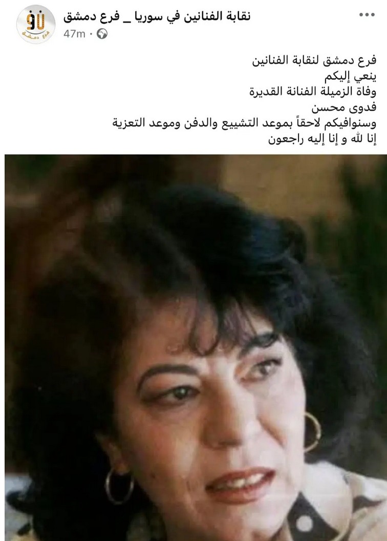 عن عمر ناهز 82 عامًا، توفيت الممثلة السورية فدوى محسن، بحسب ما أعلنته نقابة الفنانين السوريين، عبر صفحتها في فيسبوك.